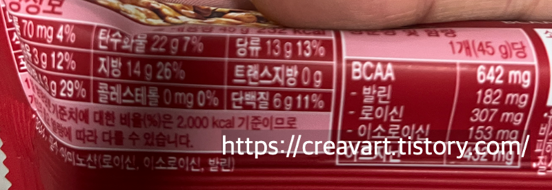 앞서 말씀드린 것처럼 단백질은 12g 으로 약 22%에 해당됩니다. 액티브바 1개의 중량은 50g.