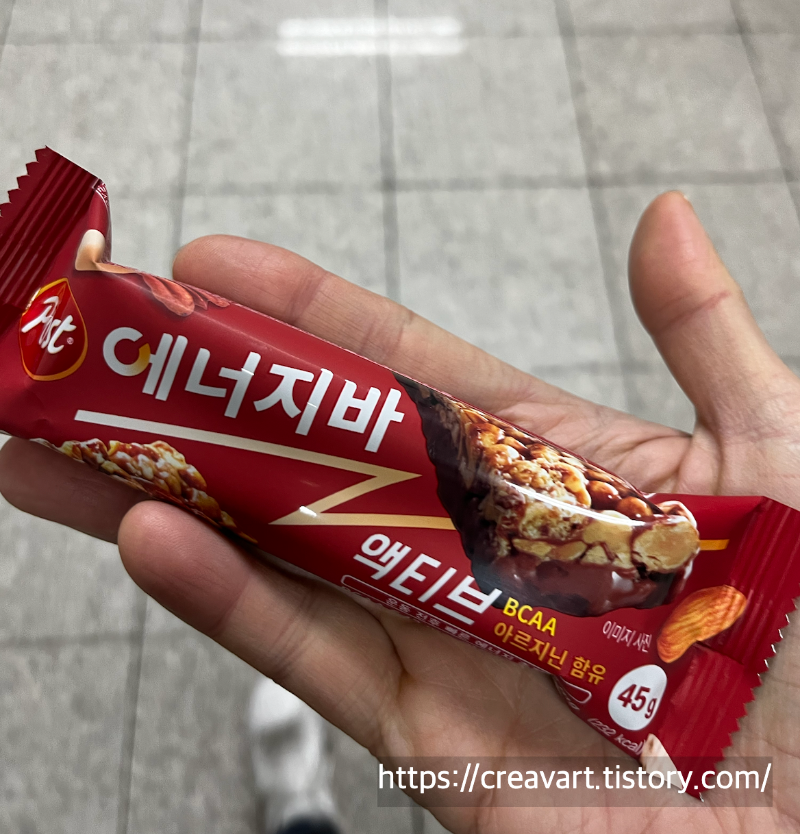 편의점에서 구매한 포스트 에너지바 액티브입니다. 45g이라고 써 있어서 헷갈리지만 에너지바 1개의 중량입니다.