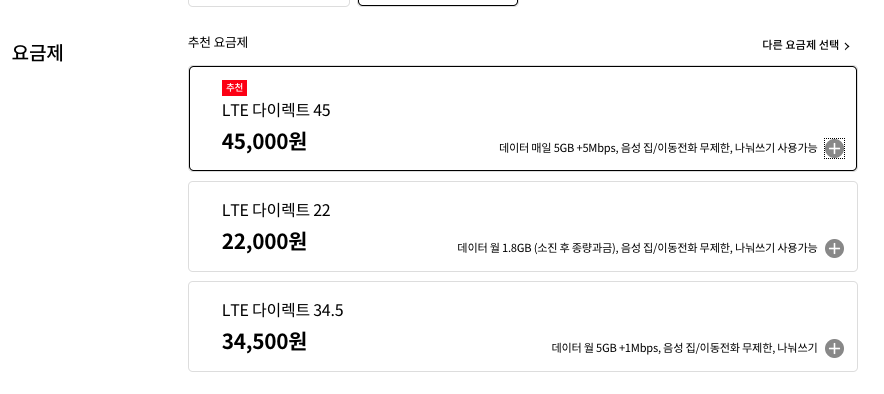 유플러스의 경우 다이렉트 요금제라는 비교적 저렴한 요금제가 있지만, LTE요금제 중 저렴한 것이 데이너 월 1.8GB 밖에 주어지지 않아 아쉽습니다.