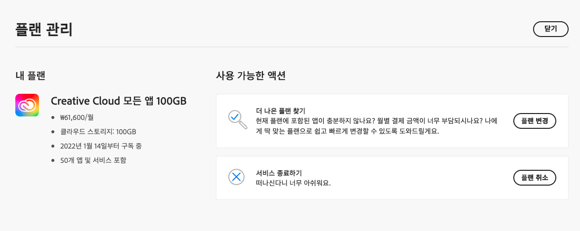 플랜관리를 누르면 플랜변경, 플랜취소를 선택할 수 있고 플랜을 adobe 제품을 더이상 구독하지 않으려면 플랜 취소를 하면 됩니다.