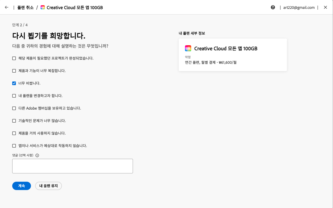계속으로 진행하면 반복해서 플랜을 유지하도록 유지하는 메시지와 화면이 나타납니다. 아니오를 선택하고 플랜을 취소하였습니다.