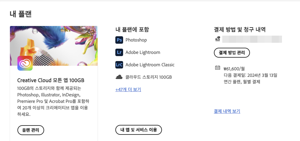 제가 사용하는 플랜은 Creative Cloud 모든앱으로 월 61600원을 결제하고 있는데요.