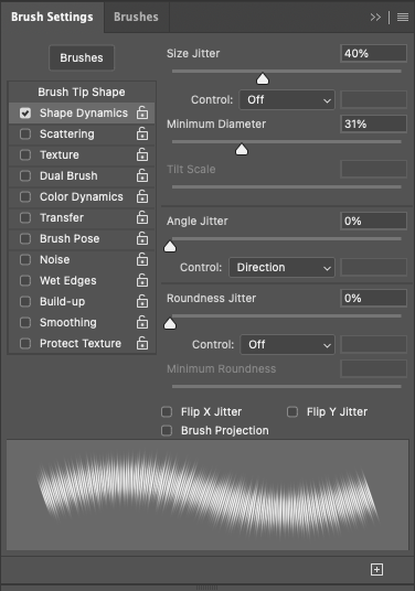 브러쉬 설정 왼쪽 메뉴에 보면 brush tip shape, shape Dynamics 두가지 만 사용하면 됩니다.