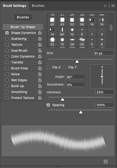 hardness는 23% 정도 줬는데 하드니스를 너무 조금 낮춰야 부드러워집니다. spacing으로 100 이상 주면 브러쉬 간에 간격이 생깁니다.