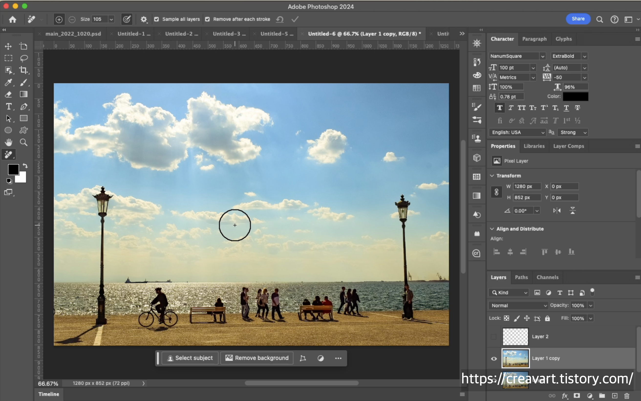 포토샵 제거도구(remove tool) 사용 방법을 알아봤습니다. 이정도로 빠른 작업이라면 유사한 작업에 도장툴을 쓸 필요가 없겠죠? 도장툴을 사용하는 방법도 익혀두는 것이 좋지만 때로는 빠른 작업이 필요할 때 remove tool이나 ai 생성형 이미지로 채우기를 해주는 것으로 충분할 수 있겠습니다. 점점 더 강력해지는 포토샵 여전히 추천드리는 이유입니다.