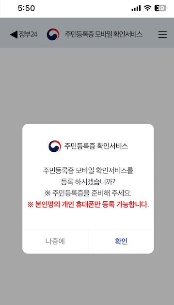 모바일 주민등록증은 본인 명의의 휴대폰 한대에만 등록 가능한 점 기억해주세요.