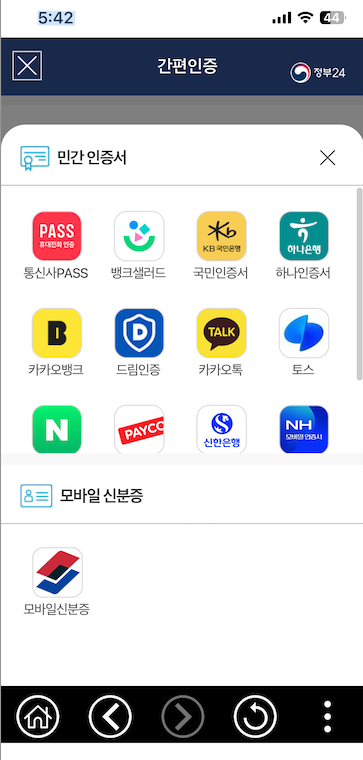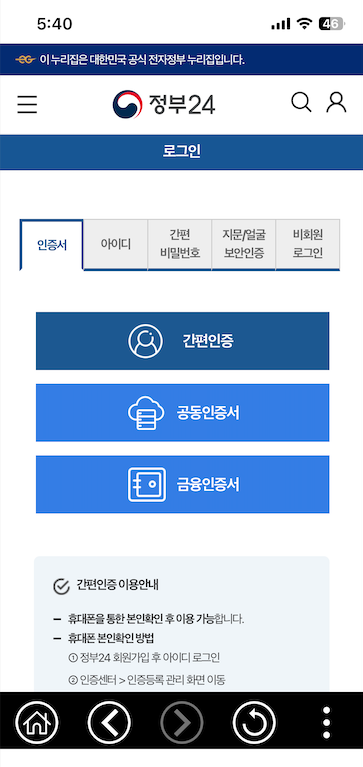 정부24 앱을 설치하고 실행시키면 아래와 같은 화면이 나타납니다.