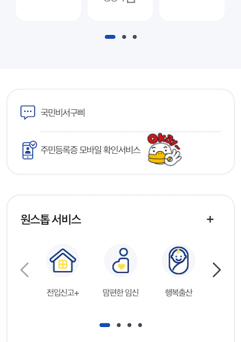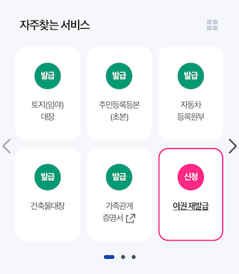 인증 완료 후 정부 24 앱으로 돌아오면 로그인이 완료됩니다. 앱 초기 화면에는 스크롤해보면 주민등록 등본도 발급 받을 수 있고 여권도 재발급 신청할 수 있는 다양한 서비스가 있으니 이용해보시기 바랍니다. 아래로 조금만 더 스크롤 해보면, 주민등록 모바일 확인서비스 메뉴가 보입니다. 눌러서 주민등록증 모바일 확인 서비스에 등록을 합니다.