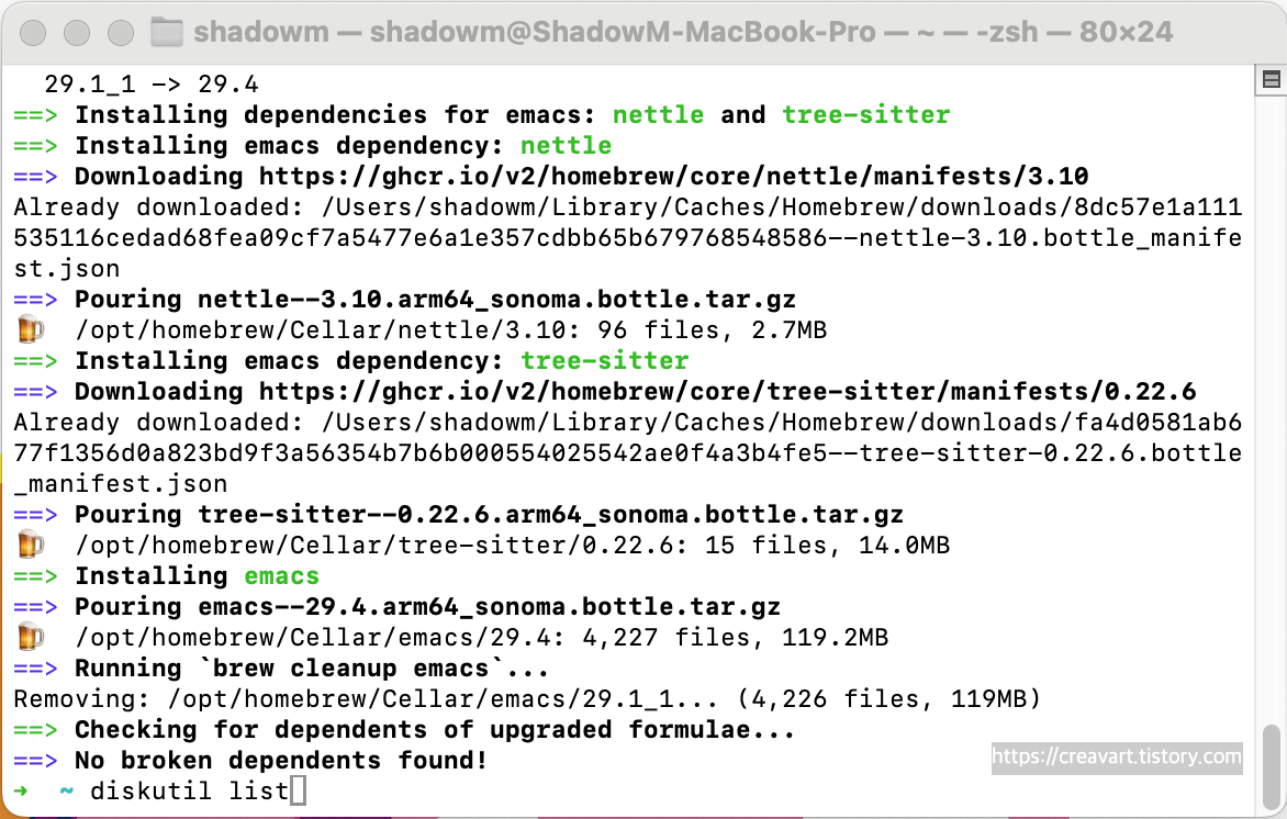 그러면 또 여러가지를 설치하는 과정을 거치게 되고 완료되면 아래와 같이 종료가 되죠. 그럼 설치할 비어 있는 USB 혹은 지워져도 되는 USB를 연결하고 diskutil list 명령어를 넣어줍니다.