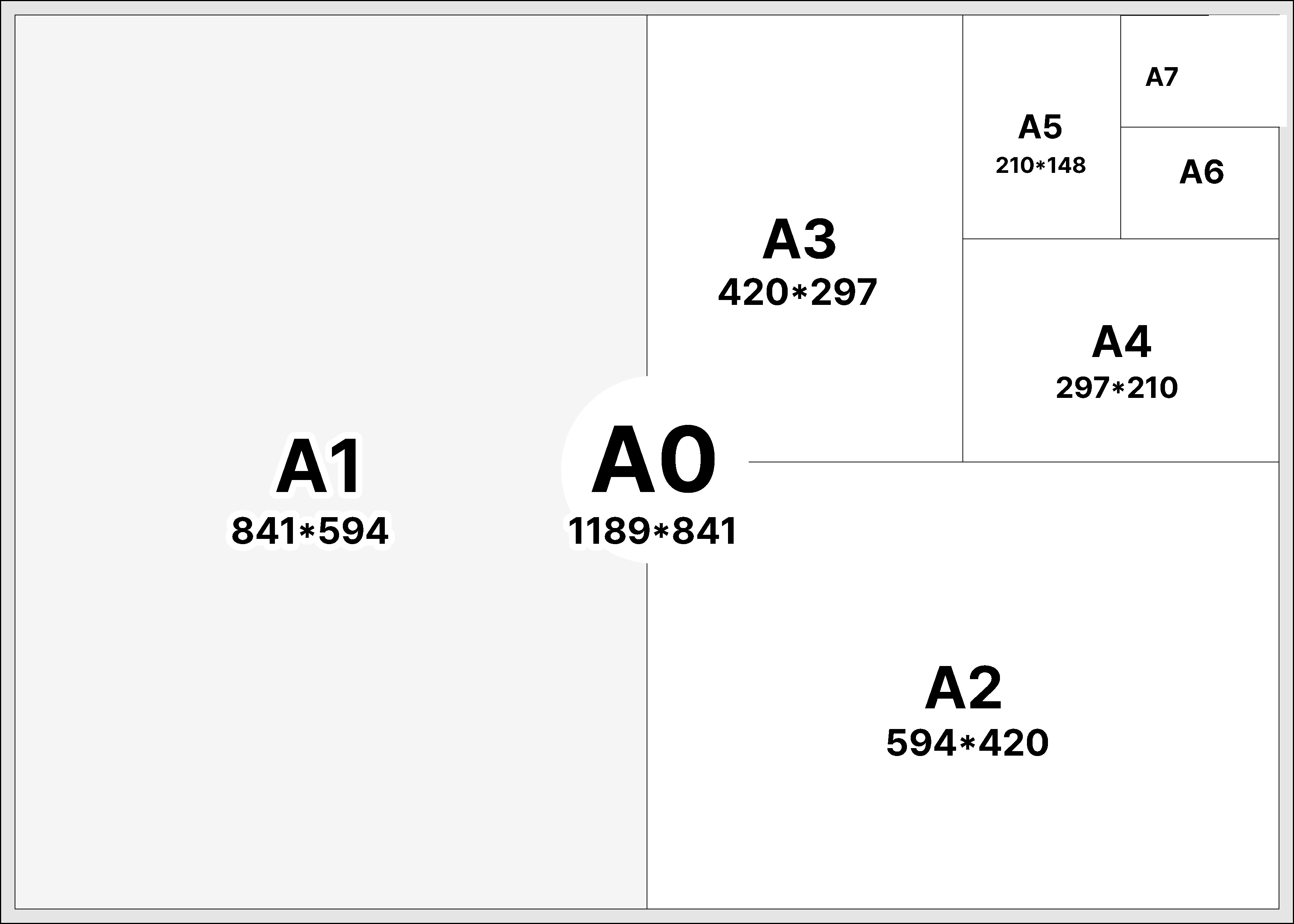포스터에 많이 사용되는 A1, A2, A3 사이즈는 각각 841x594, 594x420, 420x297mm입니다. A4사이즈는 복사용지로 익숙한데, 여성잡지나 브로슈어 작업에도 많이 사용되는 사이즈입니다.