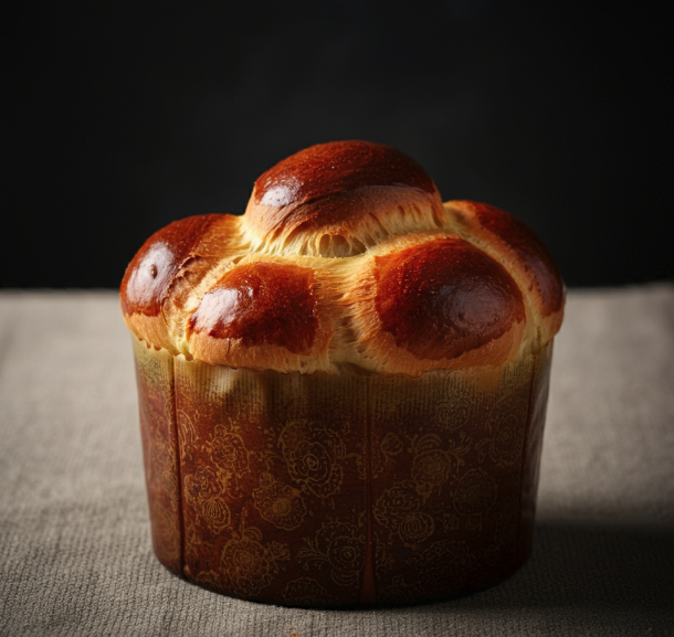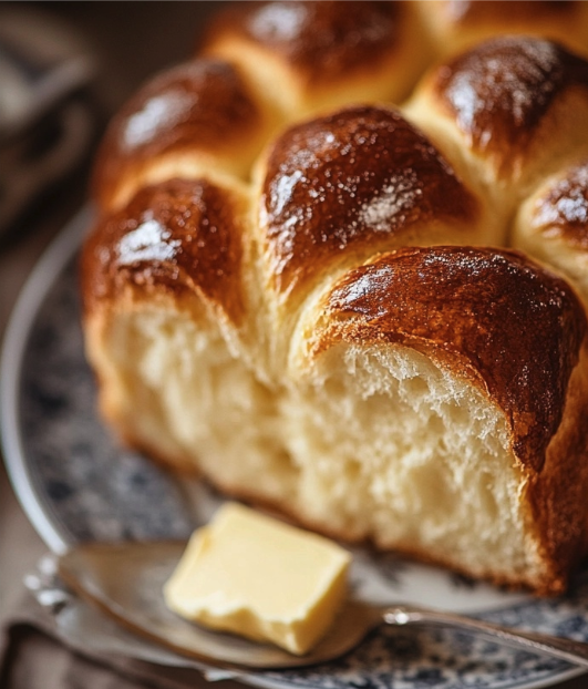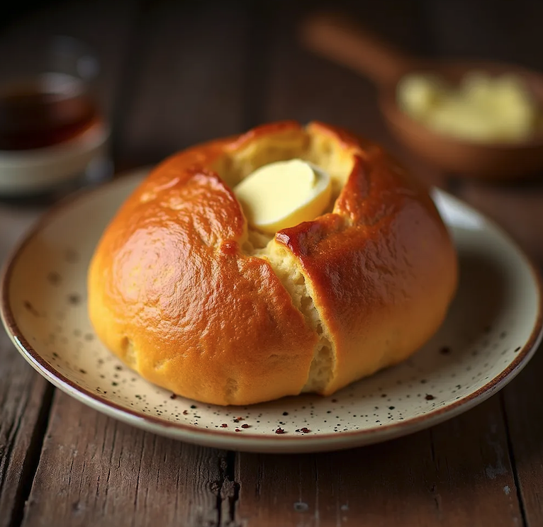Soft brioche à tête with a golden crust, served warm with sweet butter food photography