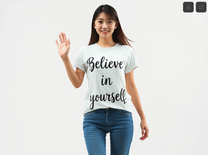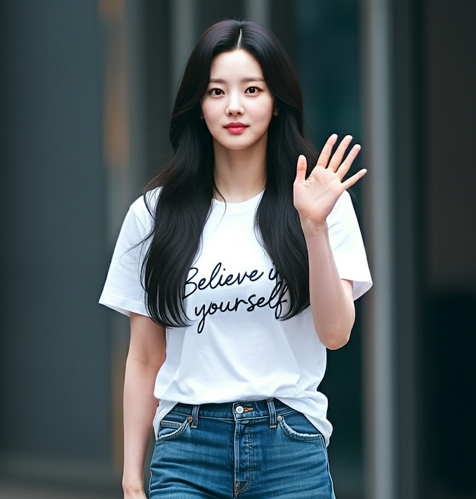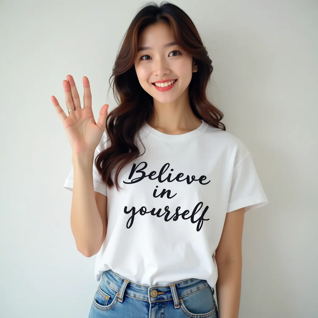 very best quality photography realistic korean woman, wearing t-shirt printed ' Believe in yourself ' handwriting text, full body, blue jeans, waving a hand