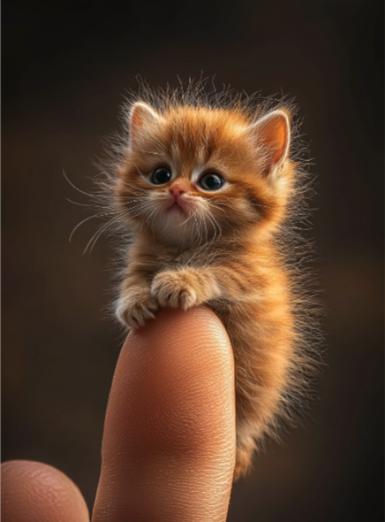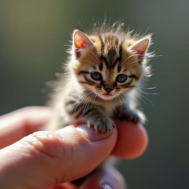 18h Ultra-realistic 8K photograph, a tiny kitten with disheveled fur sitting on a human index finger, the finger is positioned sideways with clear detail of the skin’s texture. The kitten’s messy hair adds character to the scene, background is slightly out of focus, natural light gently highlights the subjects, shot with a Leica Q2, strong color contrast and sharp clarity