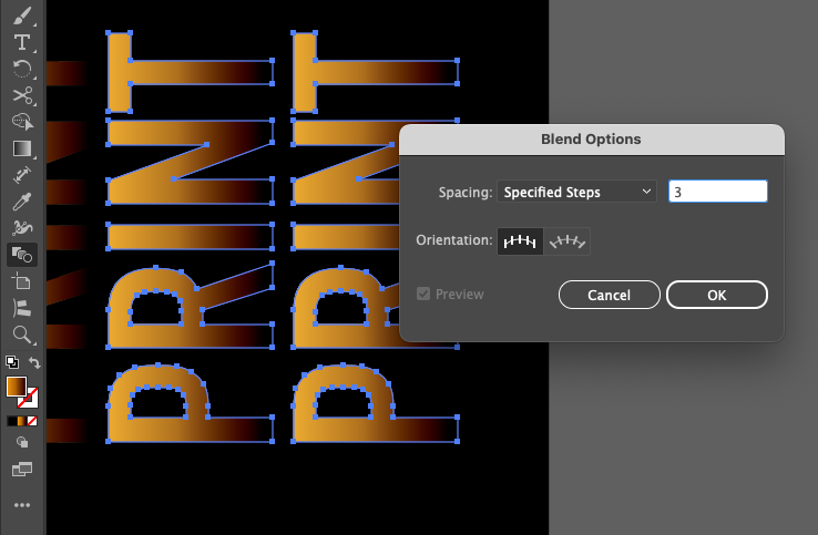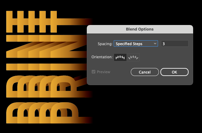 텍스트를 아웃라인화 해주고 그라데이션 그라데이션 준 다음 복제해서 배치합니다. 두개의 복제된 텍스트를 선택하고 다음으로 블렌드 툴을 더블 클릭해서 블렌드 옵션을 Specified Steps 선택, 3으로 해줍니다.