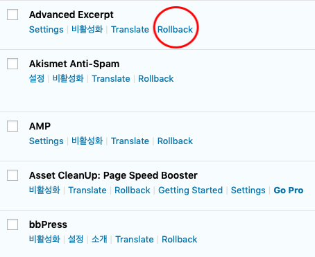플러그인을 설치 후 활성화 시키면 설치된 플러그인 각각에 rollback이라는 텍스트버튼이 나타납니다.