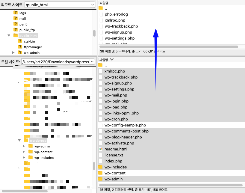저는 FTP 프로그램으로 파일질라(filezilla)를 사용하고 있습니다. filezilla를 기준으로 설명드리면 위의 사이트에서 내려 받은 파일을 압축해제하면 해당 버전의 파일들이 담긴 "wordpress"폴더가 나오는데요, 파일 중에서 wp-config-sample.php와 wp-content 폴더 두가지를 제외한 나머지 파일과 폴더(디렉토리)들을 모두 워드프레스가 설치된 곳에 올려서 덮어씌워 줍니다.