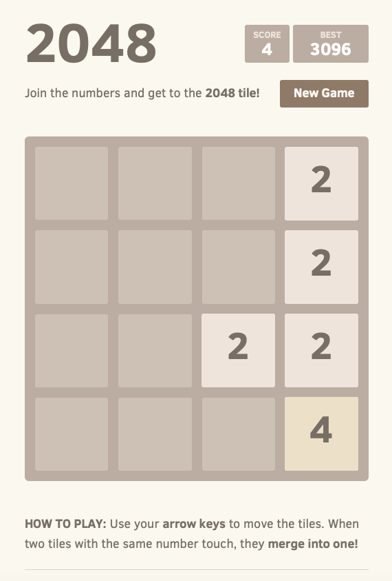 Join the numbers and get to the 2048 tile! New Game How to play: Use your arrow keys to move the tiles. When two tiles with the same number touch, they merge into one! Note: This site is the official version of 2048. You can play it on your phone via http: