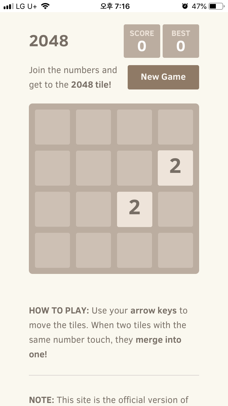 게임화면은 이렇게 되어 있고, PC에서는 방향키를 이용해서 나란히 있는 같은 숫자를 이리저리 밀어서 합산을 해서 2048을 만들면 승리하는 게임입니다.