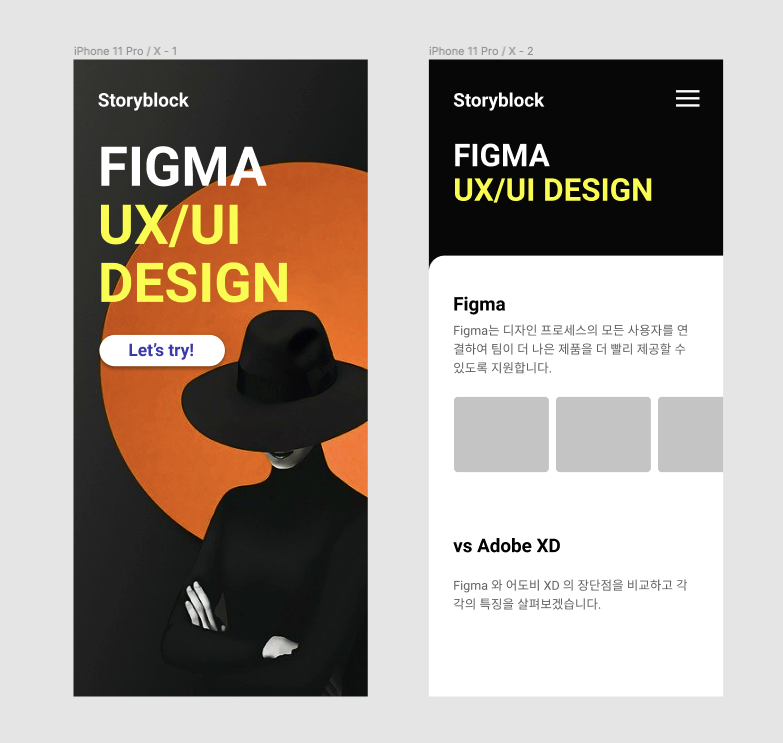 간단히 이미지 UI 2개를 만들어봤습니다. 랜딩페이지와 서브페이지입니다. 대부분의 작업이 XD 와 유사한데 불편한 단축키가 조금씩 다른 부분이 있고, 마우스 오른쪽 버튼을 눌러서 구성요소를 앞으로 보내거나 뒤로 보낼 때 익숙하지 않아서 그런지 잘 작동이 안되는 면이 있습니다.