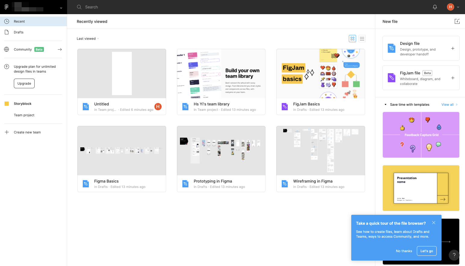 피그마 무료버전은 는 3개의 프로젝트 각각의 프로젝트당 3개의 아트보드를 생성할 수 있습니다. 총 9개의 아트보드를 생성할 수 있습니다. 저는 혼자서 테스트를 해보는 거라 스타터(Starter) 무료버전을 이용하기로 했습니다. 협업이나 프로젝트 규모가 좀 있다면 유료버전을 쓰셔야 해요.
